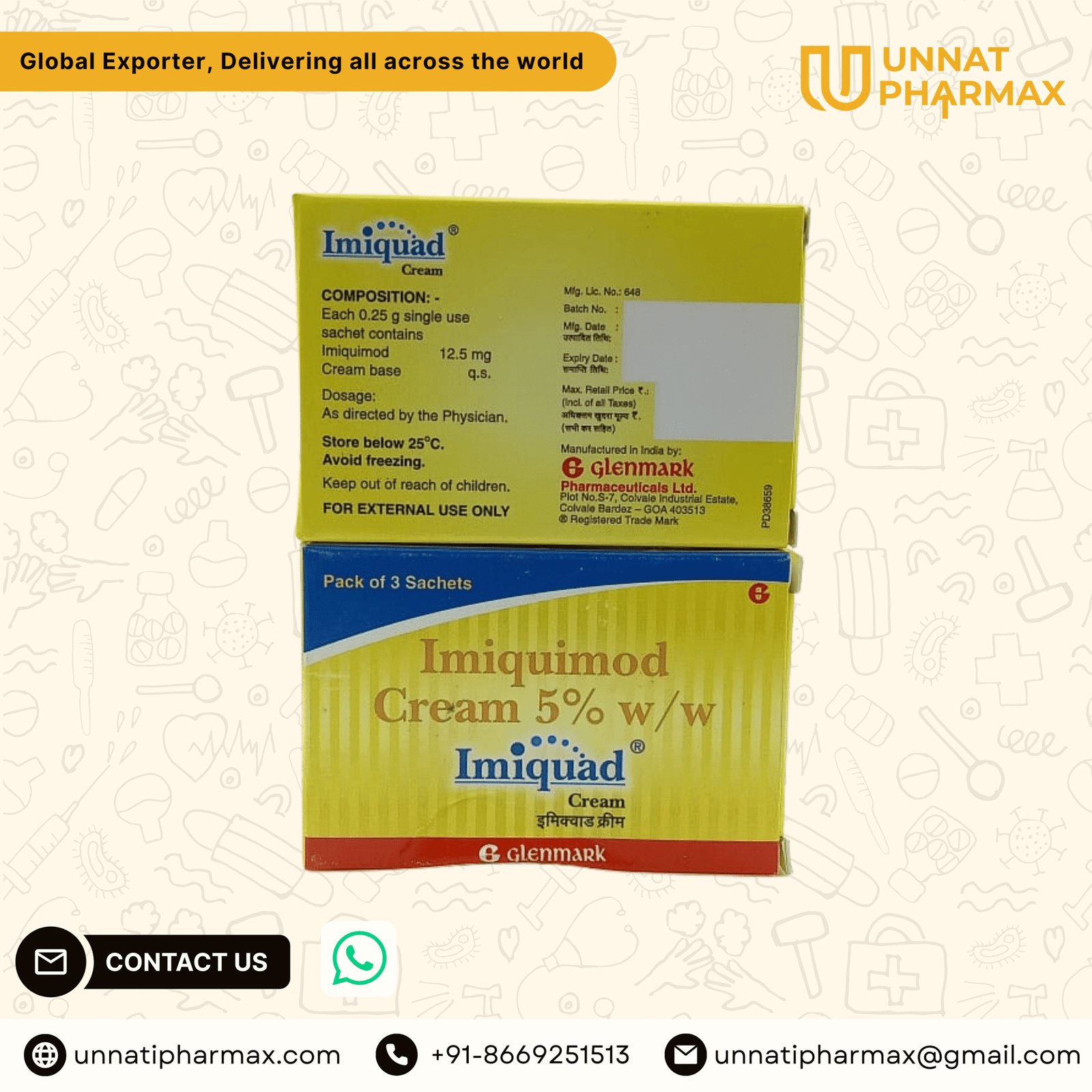 Imiquad Cream (0.25gm Each) is used to treat genital warts caused by human papillomavirus (HPV) and actinic keratosis, a precancerous skin condition resulting from long-term sun exposure. It works by boosting your immune system to target and remove abnormal cells or viral infections.