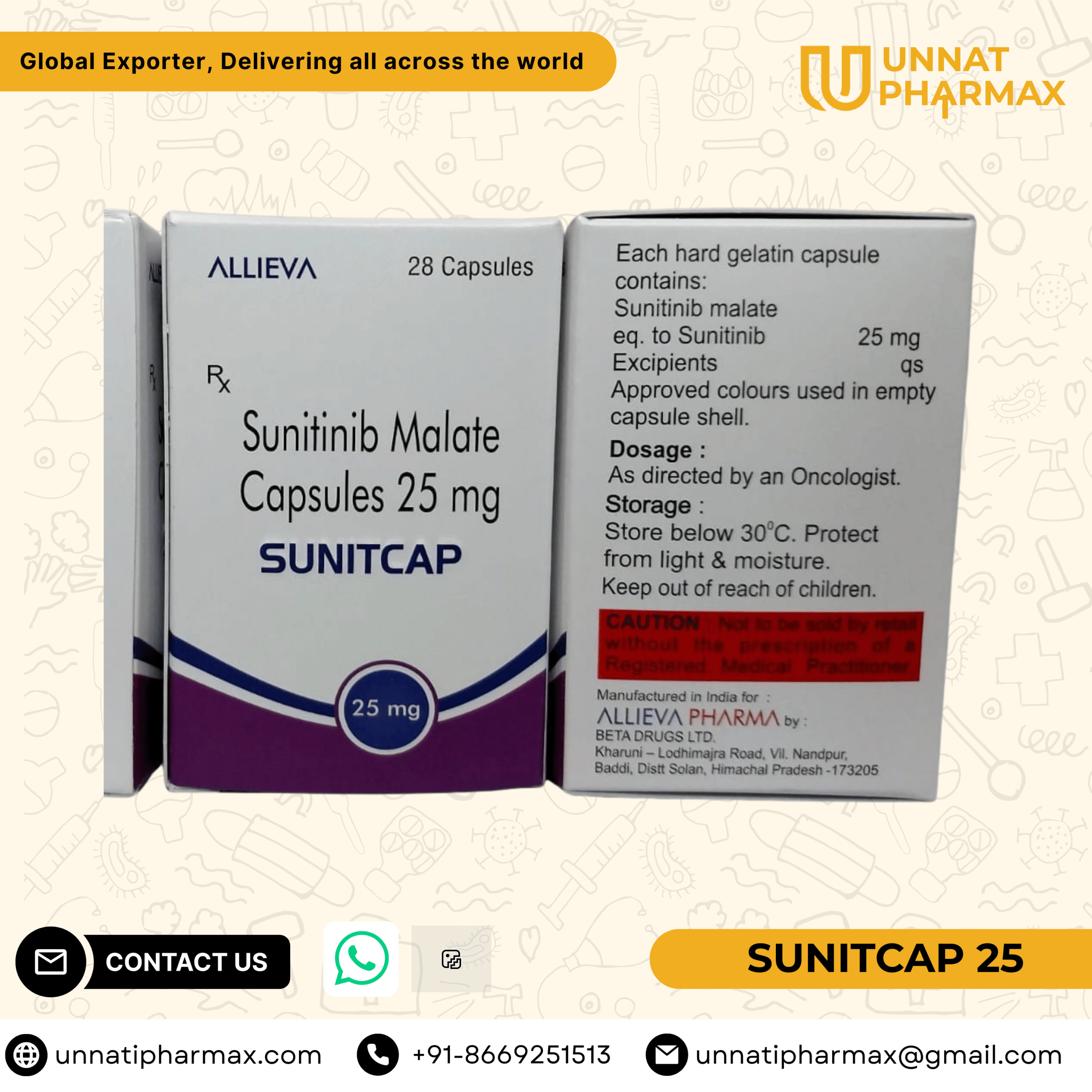 Sunitcap Capsule is a medicine used in the treatment of kidney cancer and gastrointestinal stromal tumor. It works by blocking specific enzymes that promote the growth of cancer cells. This way it shrinks the tumor and slows down its progression.