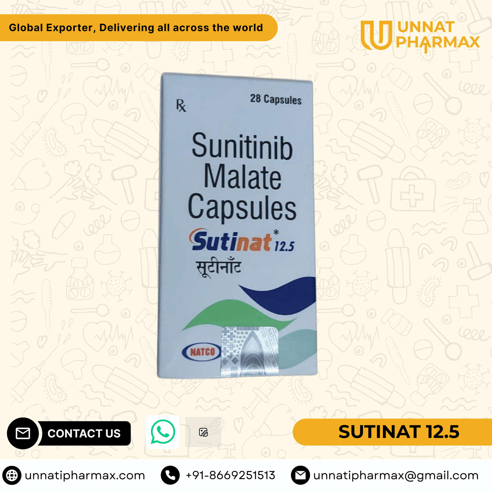 Sutinat 12.5mg Capsule is a medicine used in the treatment of kidney cancer and gastrointestinal stromal tumor. It works by blocking specific enzymes that promote the growth of cancer cells. This way it shrinks the tumor and slows down its progression.