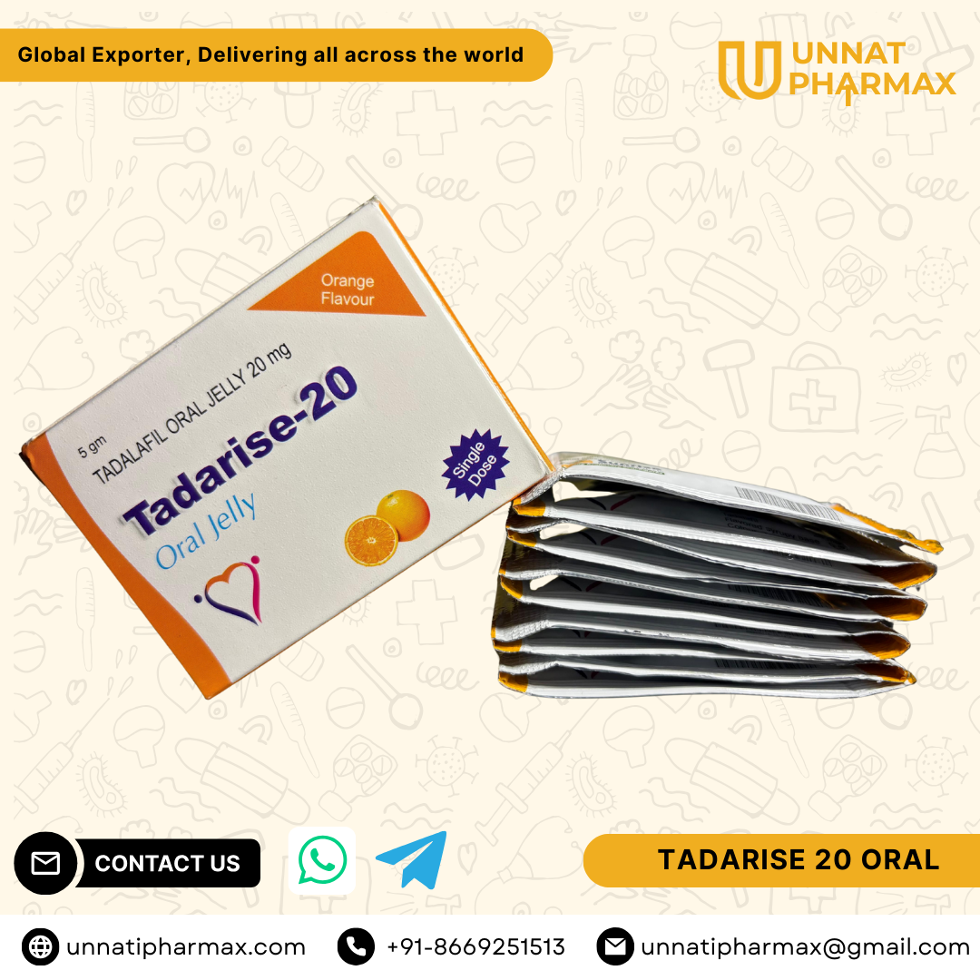 Tadarise 20mg Oral Jelly contains Tadalafil, a PDE5 inhibitor that relaxes blood vessels and increases circulation to the penis. This process allows for a stronger and longer-lasting erection when combined with sexual stimulation. The jelly form ensures faster onset of action compared to conventional pills.