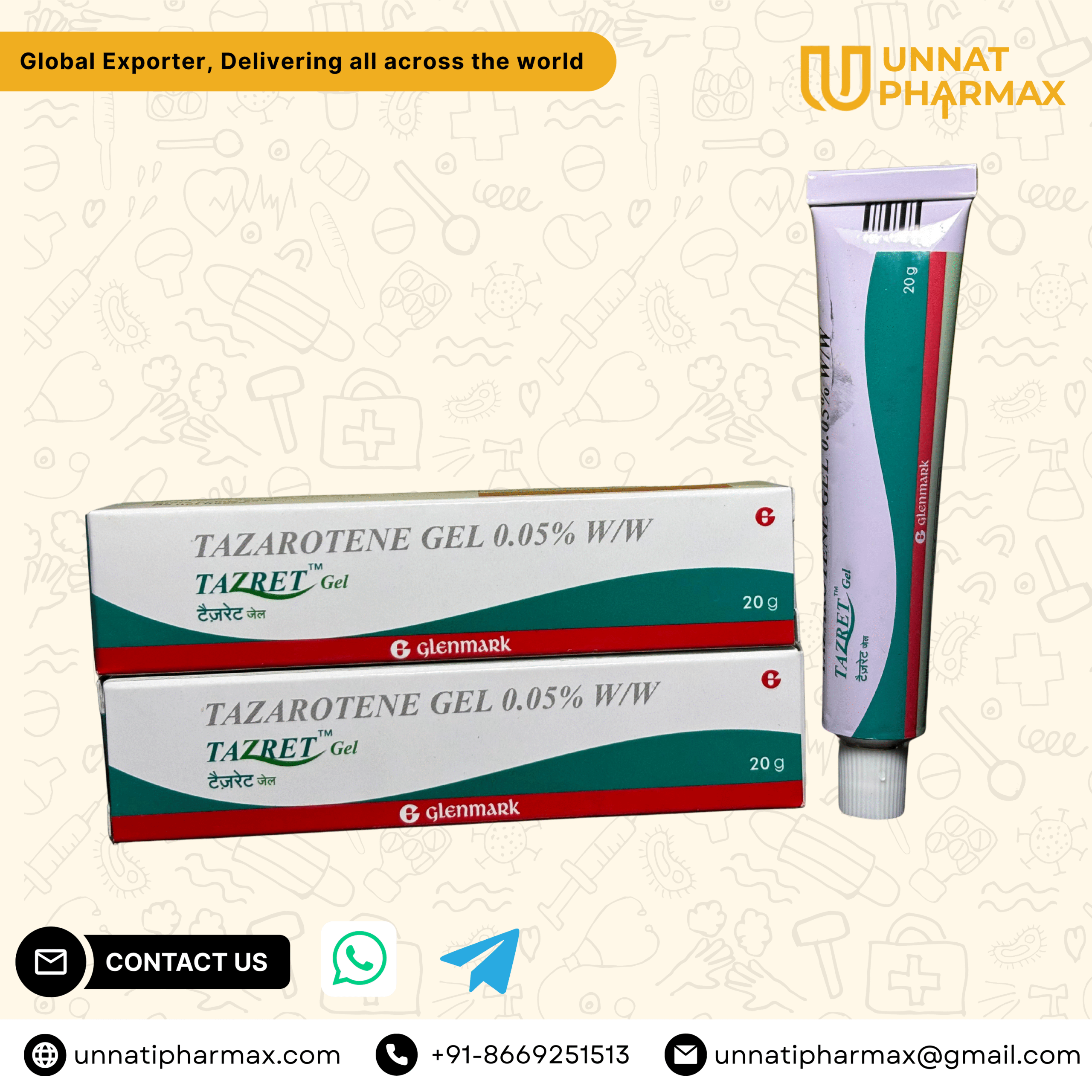Tazret Gel is a medicine used in the treatment of psoriasis and acne. It works by stopping the overgrowth and thickening of skin cells. Use it only on the affected areas and do not apply it to the healthy skin.