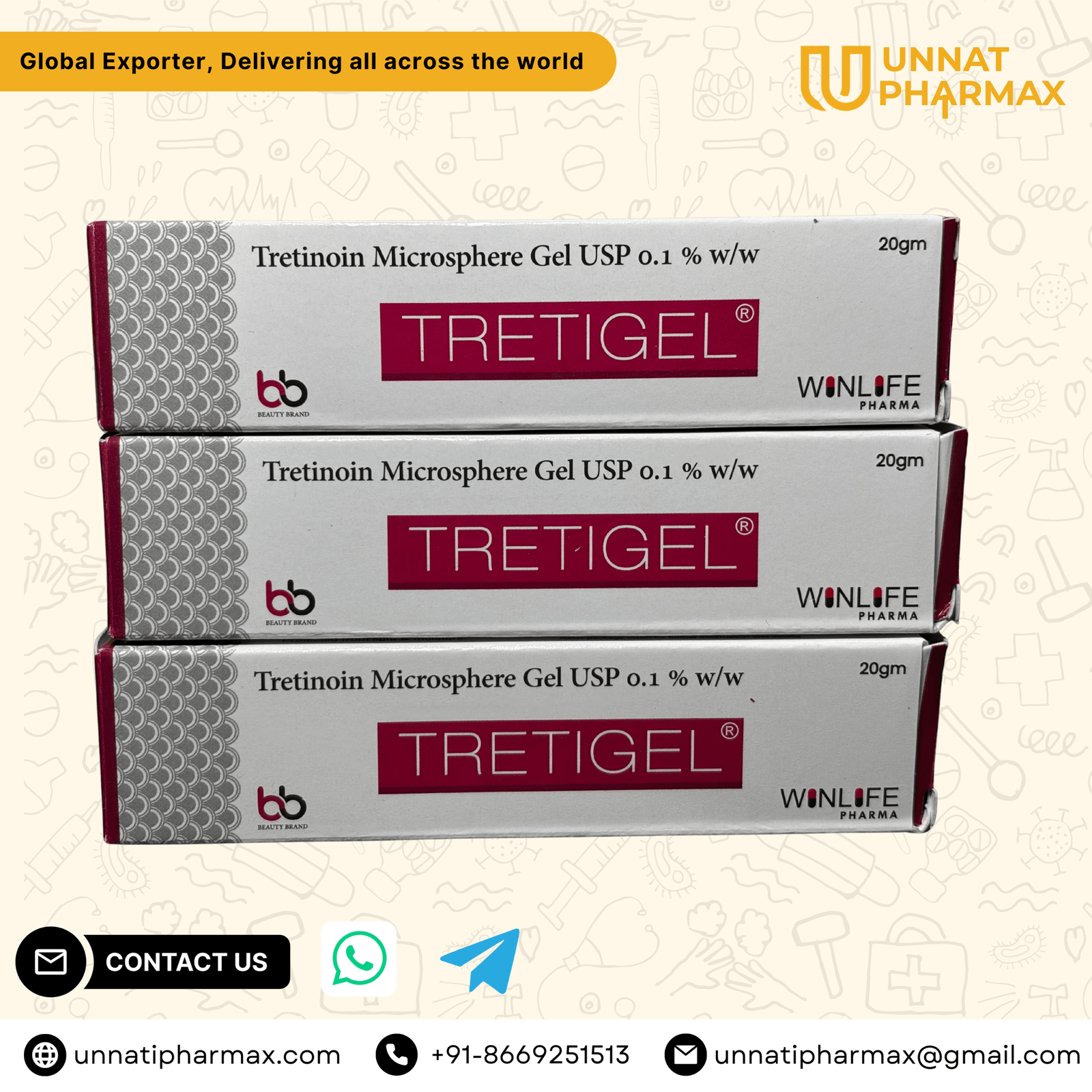 UnnatiPharmax ensures high-quality, pharmaceutical-grade Tretigel Tretinoin 0.1% Gel with compliance for international shipping to Australia, Germany, Singapore, UK, US, and the Philippines.